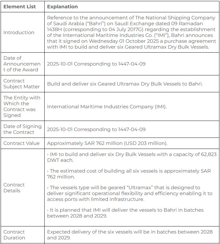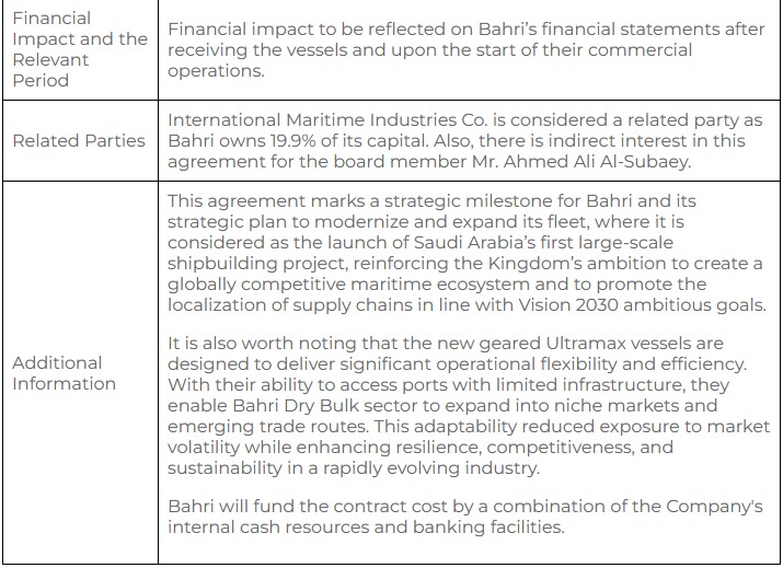 The National Shipping Company of Saudi Arabia (Bahri) Announces the Signing of Purchase Agreement with International Maritime Industries Company (IMI) to build and deliver Six Dry Bulk Vessels