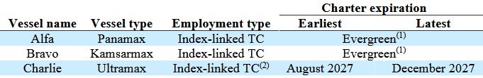 Reflecting the continued support of our charterers, the vessel will remain fully utilized and continue earning hire at a floating daily hire rate linked to the Baltic Supramax Index, adding approximately $7.2 million to Icon's estimated minimum contracted revenue. The index-linked mechanism enables the Company to capture additional value in a strengthening market, while preserving the option to convert to a fixed daily hire rate, at a time and for a period of its choosing, thereby locking in forward earnings. Lastly, the agreement provides for compensation related to fuel cost savings derived from the vessel's scrubber, creating multiple avenues for additional upside. Fuel costs will be borne by the charterer, keeping the Company insulated from the direct impact of oil price volatility on its cost base, which is particularly relevant in light of recent swings in oil markets. Fleet We generate our revenues by chartering our vessels to regional and international dry bulk operators, commodity traders and end users, primarily on time charters ("TC") (either index-linked or fixed rate) or voyage charters, depending on market conditions, opportunities available to us, and other strategic and tactical considerations. As of the date hereof, our fleet comprised of the following dry bulk vessels: (1) The charter continues indefinitely, subject to 3 months' termination notice by either party (2) In addition to the daily hire rate, we are also entitled to receive part of the fuel cost savings to be realized by the charterer through the use of the vessel's scrubber Key Performance Indicators used in this Press Release