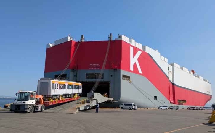 Kawasaki Kisen Kaisha, Ltd. ("K" LINE) received an order for the maritime transportation of train cars for the first phase of Cairo Metro Line 4 being delivered by Mitsubishi Corporation and The Kinki Sharyo Co., Ltd. to the Egyptian Ministry of Transportation. The first shipment of eight cars has been loaded onto "K" LINE's IGUAZU HIGHWAY car carrier, which departed from the Port of Kobe on March 12, bound for the Port of Alexandria in Egypt.