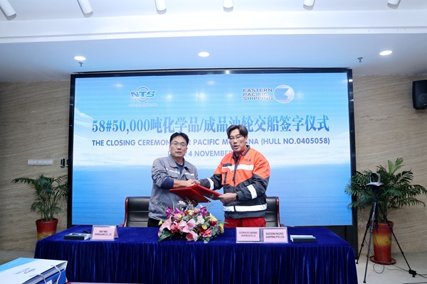 13/11/2025 On November 4, 2025, the closing ceremony for 58# 50,000 DWT Chemical/Product Oil Tanker bearing builder's hull no.0405058 was held at the meeting room on 8th floor of New Times Office Building. The company's Executive Deputy General Manager Mr. Zhang Yuyong, Deputy General Manager & Executive Director Mr. Yuan Heng and owner's representatives Mr. Ni Jie were present. The vessel was smoothly and successfully delivered by us and accepted by the Owner EPS.