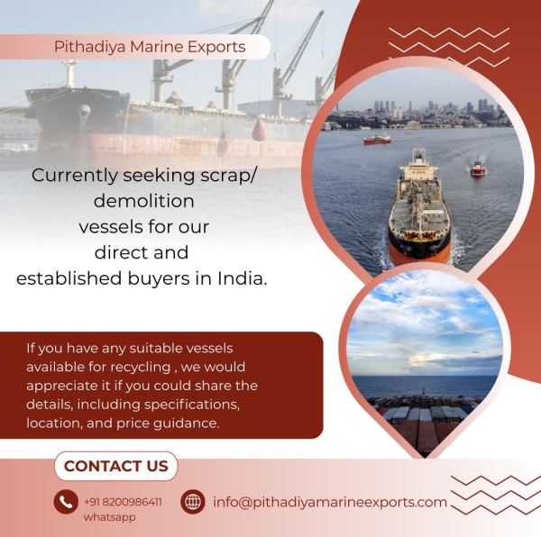 Currently seeking scrap/demolition vessels for our direct and established buyers in India. If you have any suitable vessels available for recycling, we would appreciate it if you could share the details, including specifications, location, and price guidance.