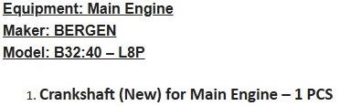 Diesel Engines | Generators | Power Plants | Crankshafts | Air & Refrigeration Compressors | Bow Thrusters | Fresh Water Generators | Oil Purifiers | Governors | Turbochargers | Hydraulic Pumps & Motors | Heat Exchangers | Main & Auxiliary Engine Spares